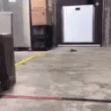 An adorable baby hippo walks towards the camera on a concrete floor in an indoor facility.