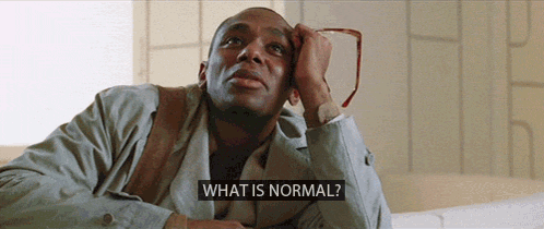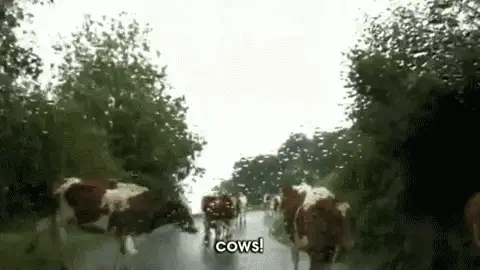 Characters from The Hitchhiker's Guide to the Galaxy ponder existential questions: 'What is normal?', 'What is home?', 'What are cows?'.