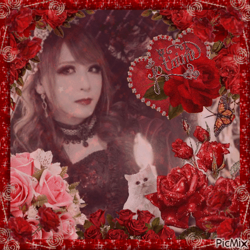 Hizaki from Versailles, framed by red roses and a heart, with a white cat.