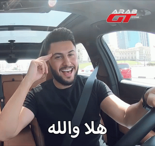 A man from Arab GT enthusiastically greets viewers with 'Hala Wallah' from inside a car.