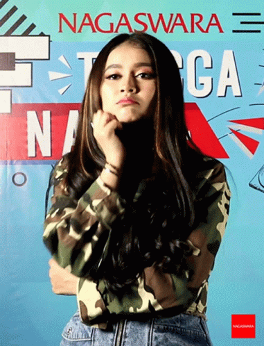 Sella Selly2Tik Tok, a woman in a camouflage shirt, looks bored or thoughtful in front of a Nagaswara sign.