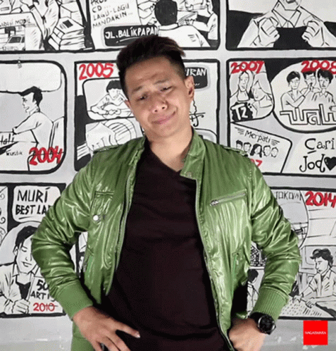 Delon shrugs with an 'Hmm Gak Tahu' expression in front of a comic art wall, wearing a shiny green jacket.