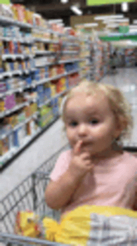 A cute baby girl in a grocery cart puts her finger to her lips, looking thoughtful and then smiling.