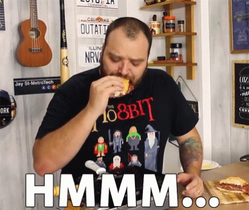 A man wearing a Hobbit-themed shirt takes a bite of a sandwich, reacting with a satisfied 'Hmmm'.
