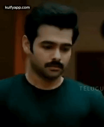 Ram Pothineni in a green shirt, looking down with a thoughtful and shy expression from Hello Guru Premakosame.