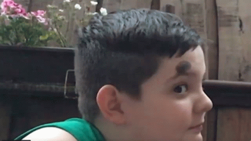 A young boy, possibly named Roli, with a distinctive dark mark on his forehead, looks curiously at the camera.