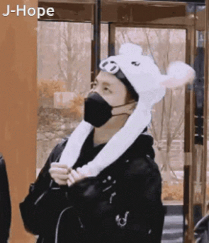 Hobi Hobi Solecito wearing a black mask and a cute white bunny hat with floppy ears.