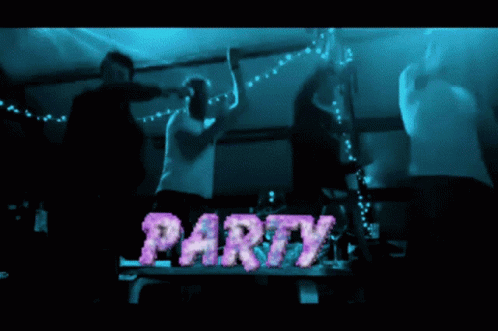 People dancing at a vibrant party with colorful lights and a 'PARTY' overlay.