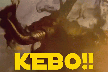 A monstrous creature with horns and glowing eyes roars, with the word 'KEBO!!' displayed.