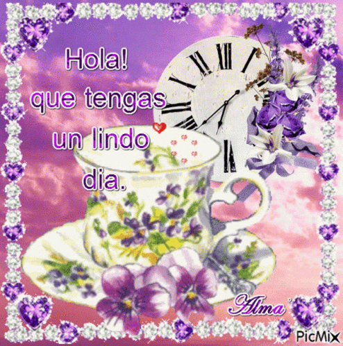 Charming image with a teacup, violet flowers, a clock, and the Spanish greeting 'Hola! Have a nice day.'