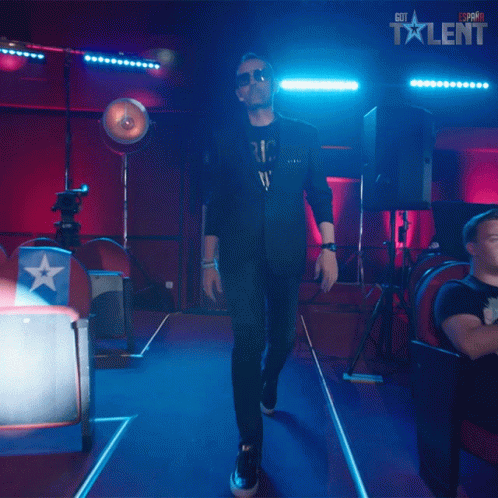 Risto Mejide walks onto the Got Talent España stage, waving to the audience in a suit and sunglasses.