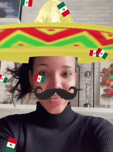 Jakelyne enjoys a fun filter, wearing a sombrero and a fake mustache, with Mexican flags raining down.