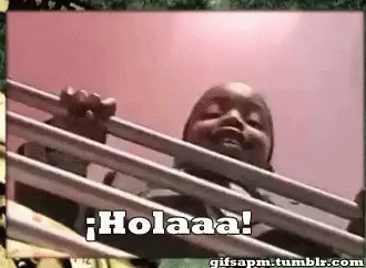 A happy child smiles and says 'Holaaa!' from behind a railing, looking up at the camera.