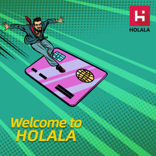 A man in a suit and glasses is surfing on a giant pink credit card with the text "Welcome to HOLALA".