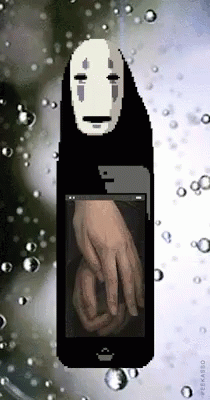 Pixel art animation of No Face from Spirited Away, with hands inside a phone and floating bubbles.