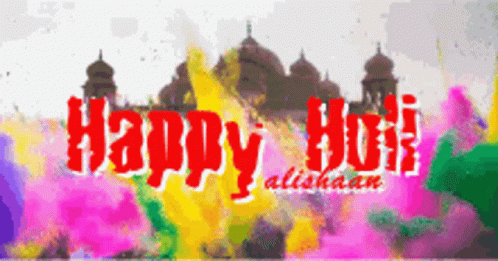 Vibrant 'Happy Holi alishaan' greeting with colorful powder and traditional Indian architecture.