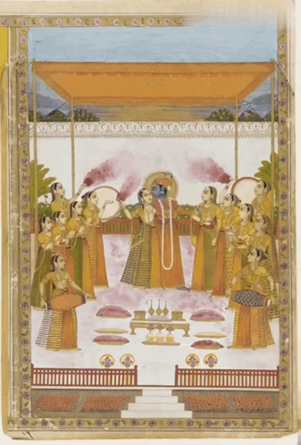 A vibrant painting depicting the Hindu festival of Holi, featuring Radha and Krishna amidst celebrations.