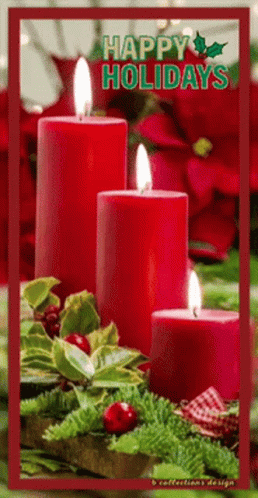 A festive Christmas decoration featuring three lit red candles, holly, and pine, with "Happy Holidays" text.