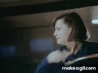 Holly Hunter in a memorable scene from Broadcast News, performing a self-choke gesture.