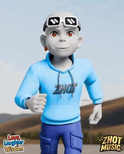a cartoon character is wearing a blue hoodie that says zhot on it