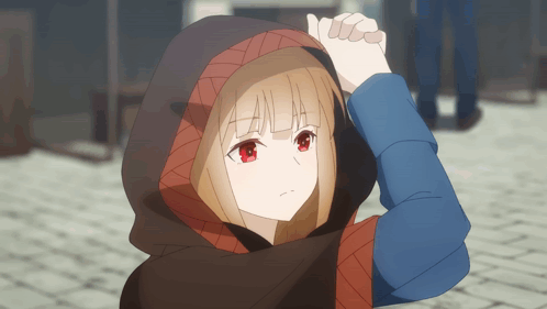 Holo from Spice and Wolf, an anime girl with red eyes and a hooded cape, looking thoughtful.
