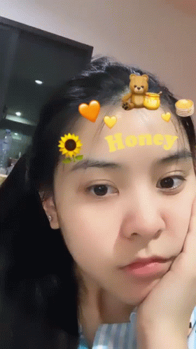 A young woman poses for a selfie with a cute 'Honey' filter featuring a teddy bear and sunflowers.