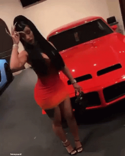 Cardi B, also known as Honeycardi, poses confidently next to a striking red classic car.