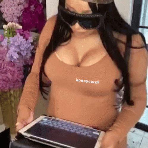 Cardi B, also known as Honeycardi, wearing sunglasses and a cap while using a tablet.
