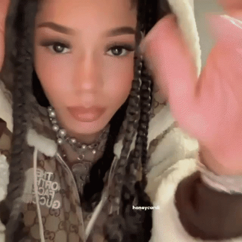 Coi Leray, also known as Honeycardi, poses for the camera, adjusting her braids and showing off her jewelry.