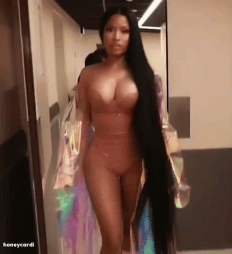 Nicki Minaj confidently walks down a hallway, showcasing her incredibly long black hair and a stylish pink bodysuit.