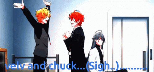 Doppo Kannonzaka and Hifumi Izanami from Hypnosis Mic share a hug, while a third character sighs in the background.