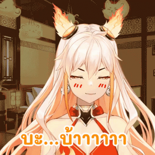 Animated character Hongfei Hinabe with long hair and fiery accessories shows a playful, expressive reaction.