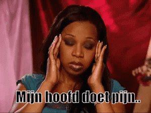 A woman expresses discomfort, holding her head with the caption 'Mijn hoofd doet pijn' (My head hurts).