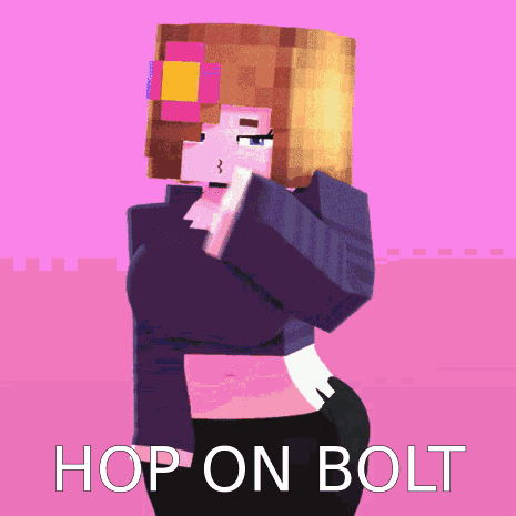 Minecraft character Jenny in a pixelated scene with the text 'HOP ON BOLT' displayed prominently.