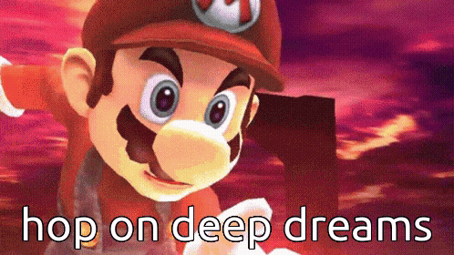 a picture of mario with the words hop on deep dreams above him