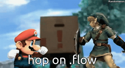 a cartoon of mario and link with the words hop on flow