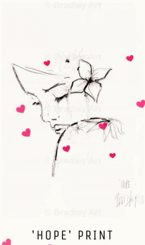 A beautiful 'HOPE' PRINT drawing by Terry Bradley, featuring a woman's profile and floating pink hearts.