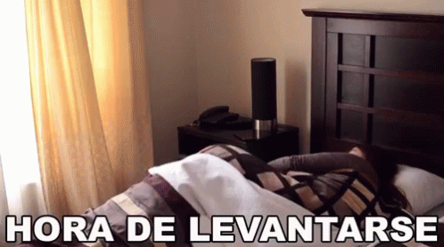 A person struggles to wake up from bed with the Spanish caption 'Hora de levantarse' (Time to wake up).