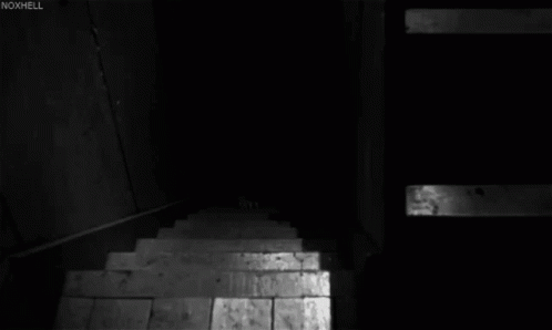 A terrifying figure crawls up a dark, dimly lit staircase in this unsettling black and white horror scene.