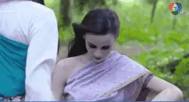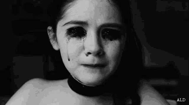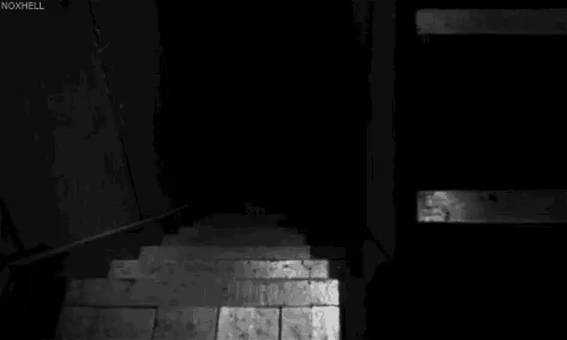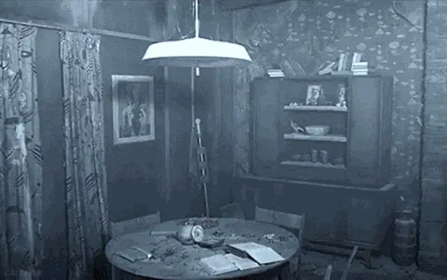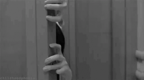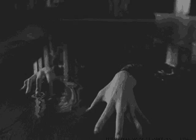 A horror figure with long dark hair and pale skin slowly emerges from behind a door in a black and white scene.