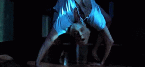 A person contorting in an extreme, unnatural pose in a dark, eerie room, creating a chilling horror scene.