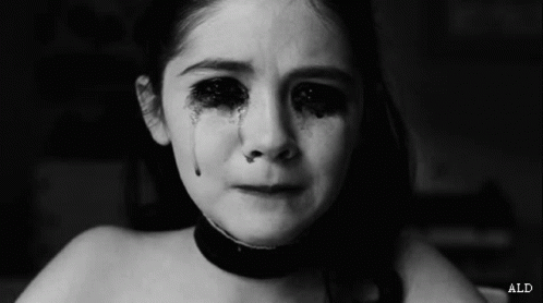 A young girl with black tears streaming down her face, creating a chilling and scary horror scene.