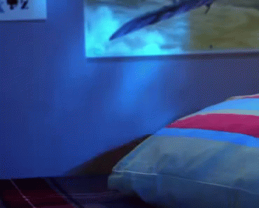 A cute green cartoon character hides behind a pillow, then jumps out in a playful horror moment.