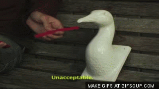 A person holds a red stick near a white duck statue that displays the word 'Unacceptable'.