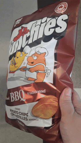 A close-up of a bag of Hostess Old School BBQ flavored potato chips, featuring cartoon characters.