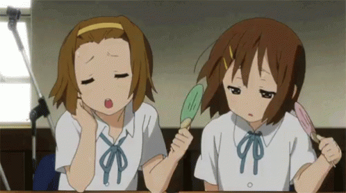 Two anime girls in school uniforms fan themselves, looking tired or hot.
