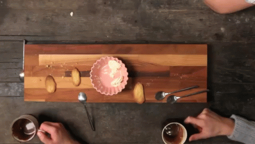 Two people enjoy hot chocolate mocha and cookies, dipping them into a creamy spread on a wooden board.