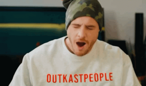 Kerem Bürsin, wearing a camouflage beanie and 'OUTKASTPEOPLE' sweatshirt, yawns and rubs his eye.