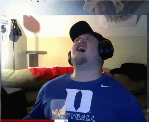 A man in a Duke Football shirt and headphones reacts intensely after eating a spicy pepper.