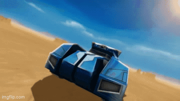 The Hot Wheels Battle Force 5 Buster vehicle drives through a sandy desert under a blue sky.